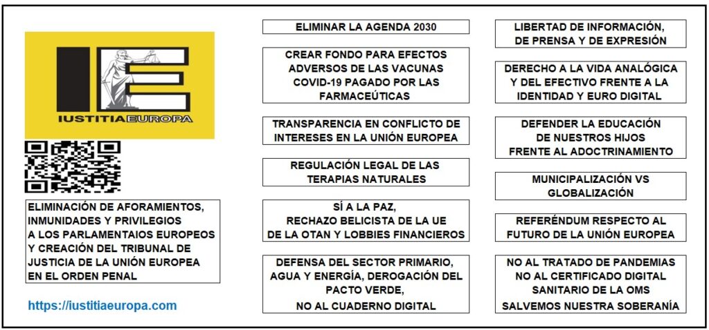 Iustitia Europa se presenta a las elecciones europeas con el objetivo principal de anular la Agenda 2030. Su presidente, Luis Maria Pardo ha luchado desde la pandemia por los derechos humanos y ha interpuesto diferentes querellas contra los organismos europeos que han intervenidos en la vacunacion masiva durante la pandemia, asi como oponerse al Tratado de Pandemias. Eliminar los aforamientos de los Eurodiputados y la creación de un Tribunal de Justicia de la Union Europea en el orden Penal son algunas de sus propuestas para estas Euroelecciones.
