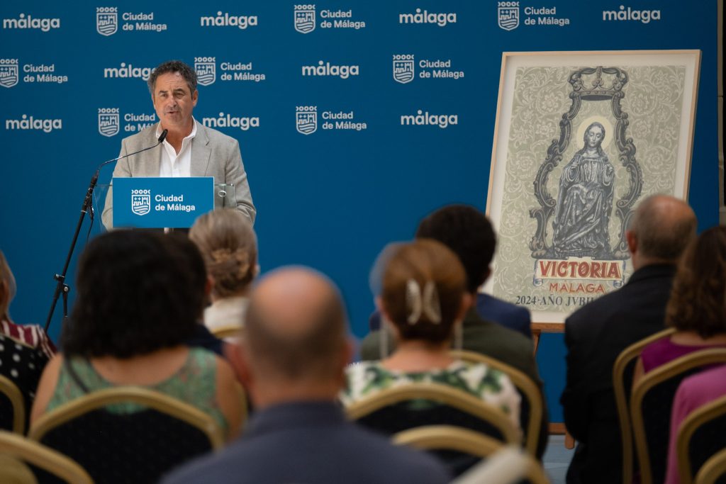 El concejal delegado del distrito Centro, Francisco Cantos, junto al hermano mayor de la Real Hermandad de Santa María de la Victoria, Miguel Orellana, ha asistido hoy a la presentación del cartel de la procesión de Santa María de la Victoria de este año, obra de Fernando Prini, que ha tenido lugar en el Patio de Banderas del Ayuntamiento