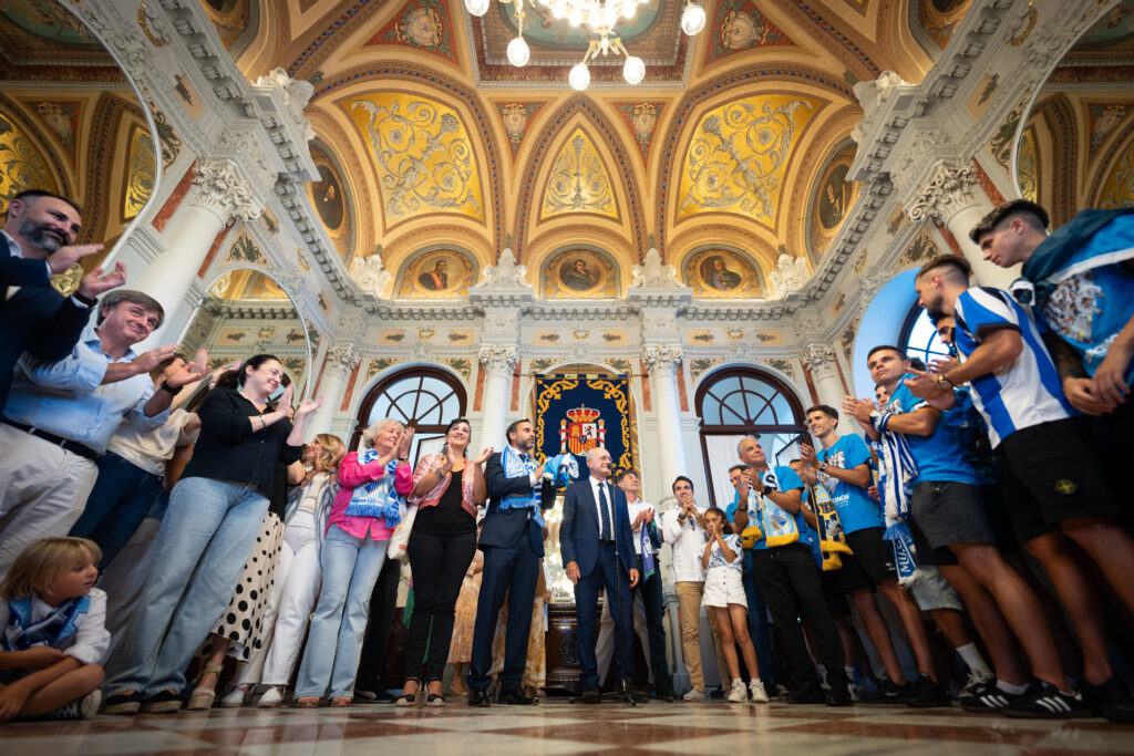 El alcalde de Málaga, Francisco de la Torre, junto al concejal de deporte, Borja Vivas, y otros ediles de la Corporación Municipal, ha recibido esta tarde en el Ayuntamiento a los jugadores, equipo directivo y técnico del Málaga CF con motivo del ascenso del club a segunda división.