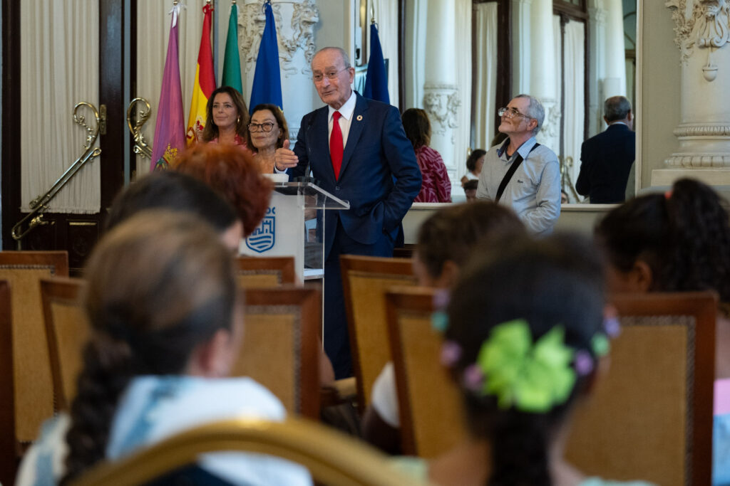 El alcalde de Málaga, Francisco de la Torre, acompañado de la concejala delegada de Cooperación al Desarrollo, Mar Torres, y otros ediles de la Corporación, ha recibido hoy en el Salón de los Espejos del Ayuntamiento a un grupo de niños y niñas saharauis que han viajado a Málaga para pasar el verano gracias al programa ‘Vacaciones en Paz’